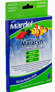 Mardel Maracyn® is a specially compounded broad-spectrum antibiotic (erythromycin) which has been shown to be effective against a number of pathogenic bacteria associated with ornamental fish disease. It was developed for complete but gradual dissolution in water. It is primarily effective against gram-positive pathogenic organisms. Symptoms of clamped fins, swollen eyes, heavy or rapid breathing, patchy coloration, change in swimming behavior or corner-hiding can be signs of possible bacterial infection.