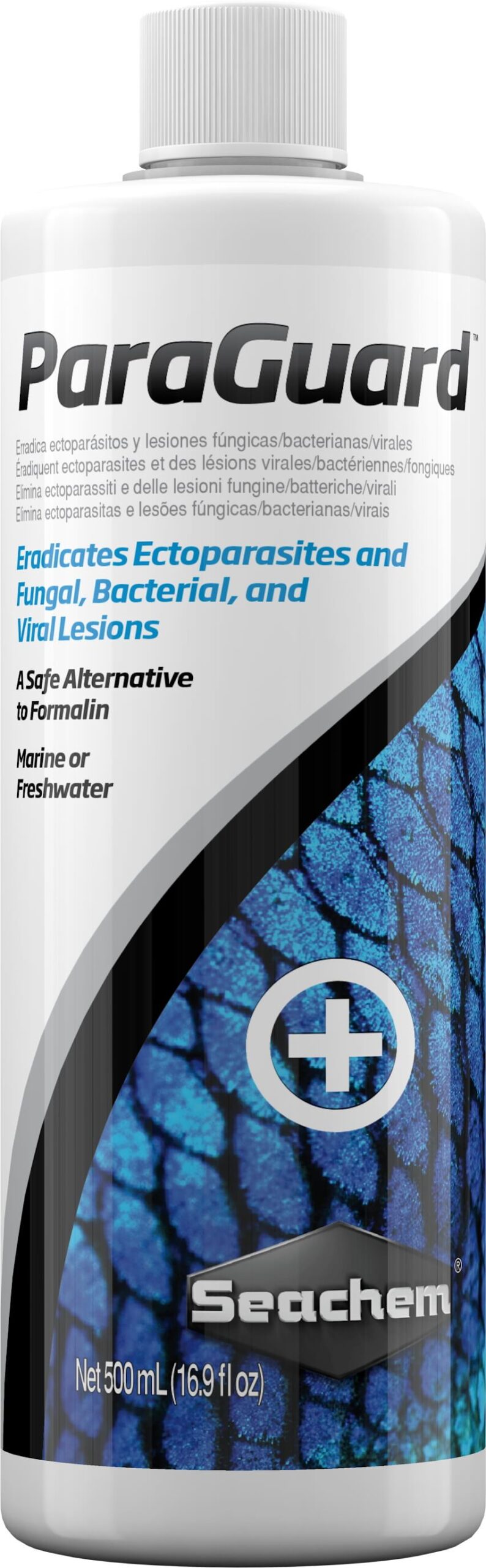 ParaGuard™ is the only fish and filter safe aldehyde based (10% by weight) parasite control product available (for parasites on fish). Unlike highly toxic and difficult to use formalin based medications, ParaGuard™ contains no formaldehyde or methanol and will not alter pH. ParaGuard™ employs a proprietary, synergistic blend of aldehydes, malachite green, and fish protective polymers that effectively and efficiently eradicates many ectoparasites (e.g. ich, etc.) and external fungal/bacterial/viral lesions (e.g., fin rot). It is particularly useful in hospital and receiving tanks for new fish and whenever new fish are introduced to a community tank.
